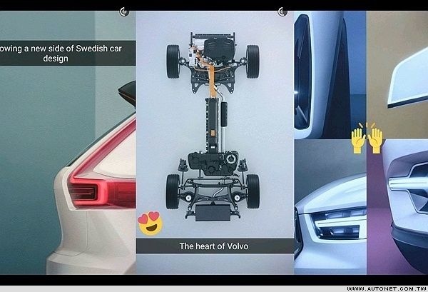 日前,VOLVO藉由年輕世代常用的SNAPCHAT APP圖片分享軟體,率先公布數張車輛細節廠照,包括正車側頭燈特寫、車頭保桿造型設計等處,再加上鮮明的The future of VOLVO、以及Not your daddy's VOLVO等字眼,不僅強調這非過往VOLVO品牌旗下車款,更藉由SNAPCHAT APP分享平台積極拉攏年輕族群的眼光。