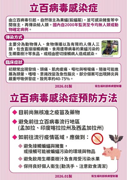 根據外媒報導,懷疑這個案是由蝙蝠及椰棗樹汁為傳染途徑,再加上立百病毒致死率高達75%,目前也沒有核准治療藥物或疫苗,加上台灣與南亞交流頻繁,不排除有境外病例,現在也被列為第五類法定傳染病。